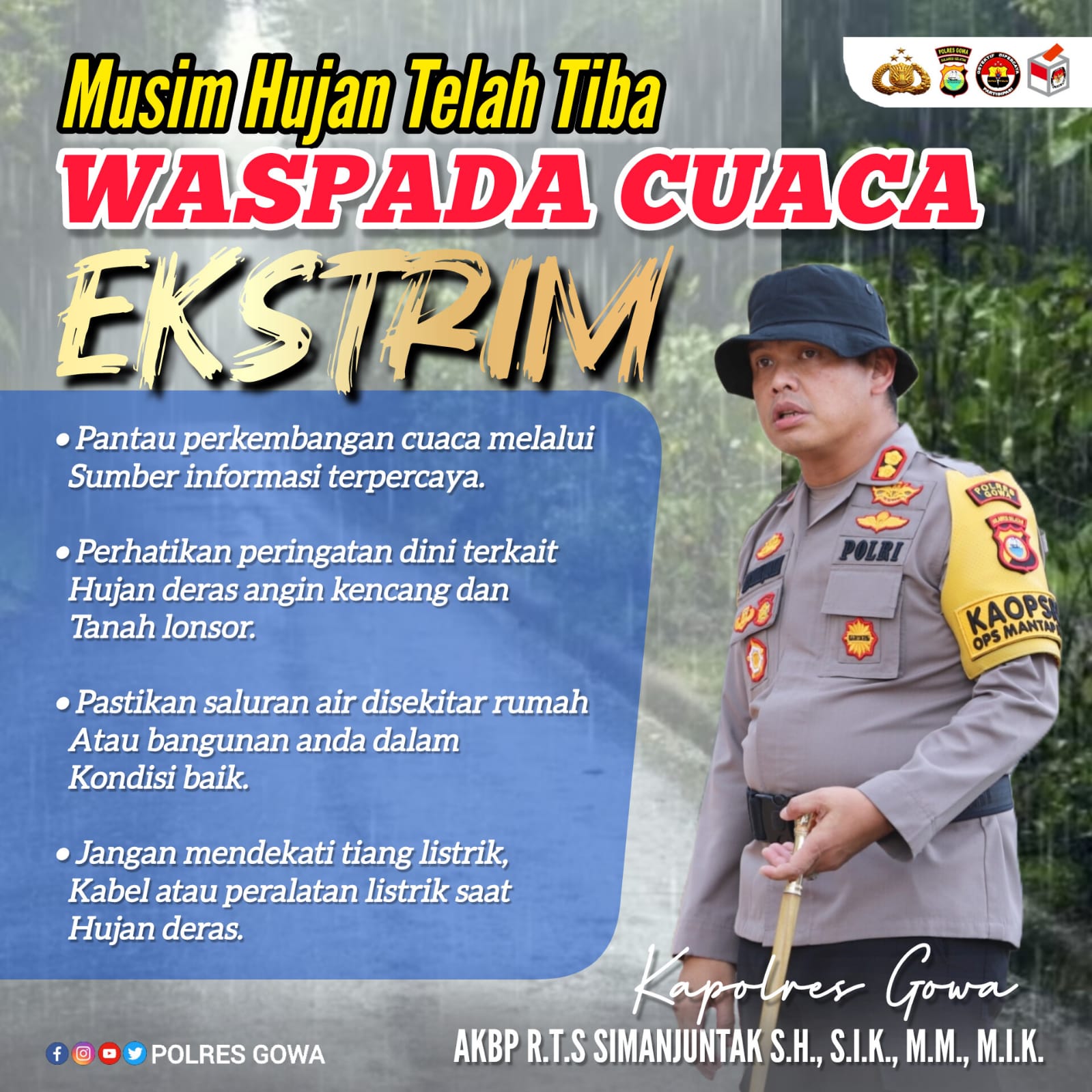 Sungguminasa, Cakrawalanews– Menghadapi musim hujan yang telah tiba, Kapolres Gowa AKBP R.T.S Simanjuntak, S.H., S.I.K., M.M., M.I.K., mengingatkan masyarakat untuk tetap waspada terhadap cuaca ekstrem yang dapat memicu berbagai potensi bencana alam, Jum’at (06/12/2024).